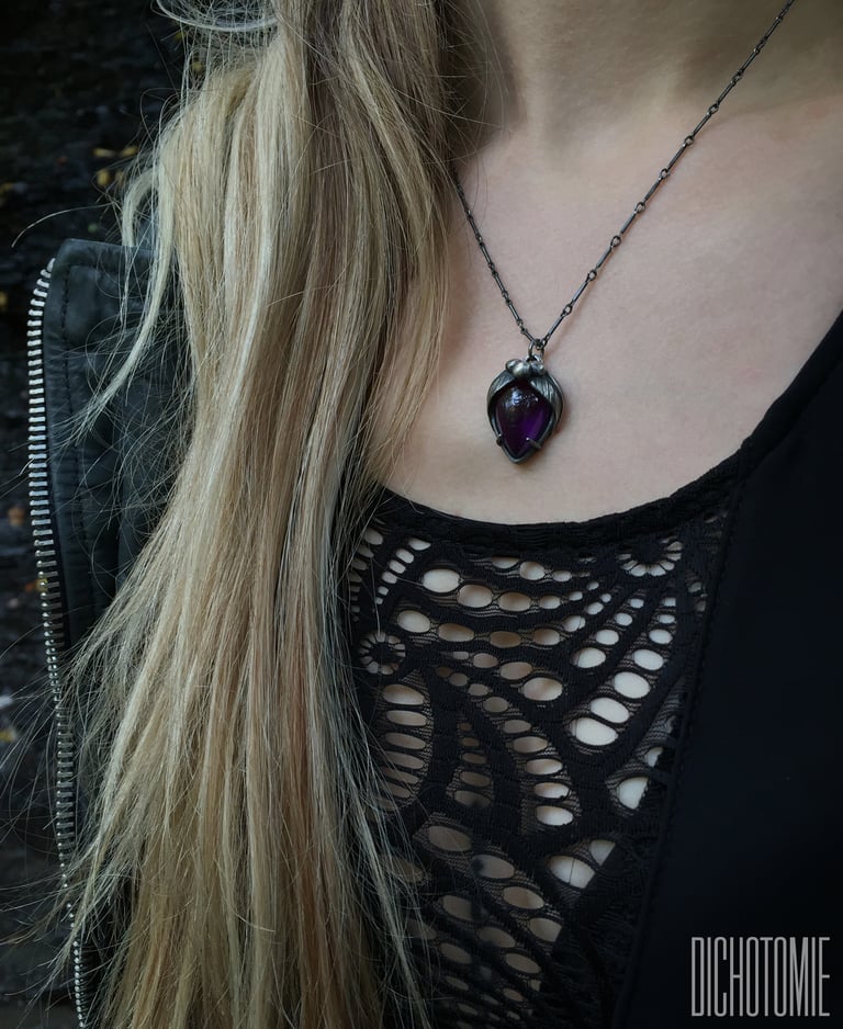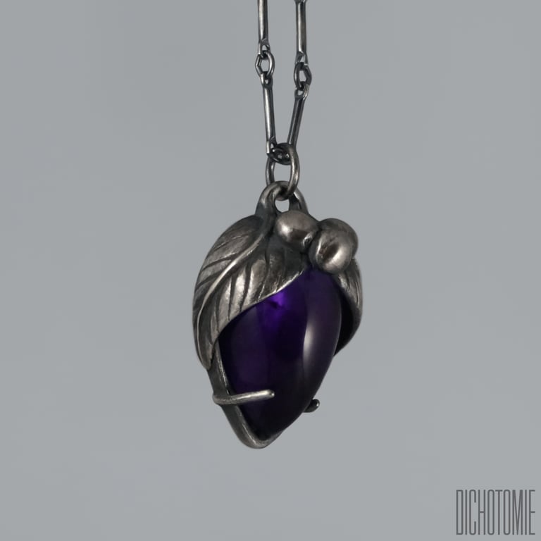 Wear La Belladonna Pendant as an amulet of protection. Harness the imagery of the deadly nightshade plant to neutralize any negative, or poisonous energies. Nightshade berries and leaves gracefully hug an Amethyst cabochon. Each piece is cast in sterling silver and is debossed with the Dichotomie monogram for authenticity. Hangs from an 18” sterling silver bar & link chain.